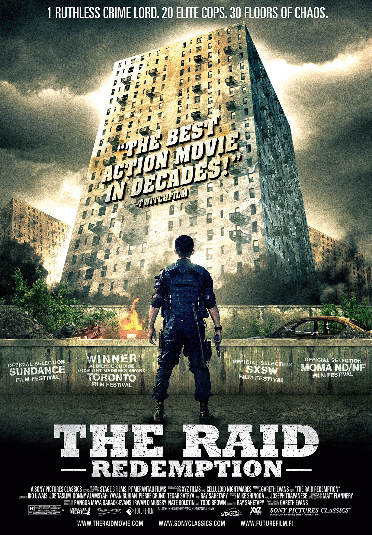 The Raid: Redemption on Indonesian hikisiin maisemiin sijoittuva, hengästyttävän kiivastahtinen toimintaelokuva. Poliisin erikoisjoukot valtaavat 30-kerroksisen rakennuksen, ja etenevät vähä vähältä kohti ylintä kerrosta ja siellä piilevää julmaa rikollispomoa. Seuraa puolitoista tuntia tiukkaa toimintaa, joka nostaa genren aivan uusiin korkeuksiin…