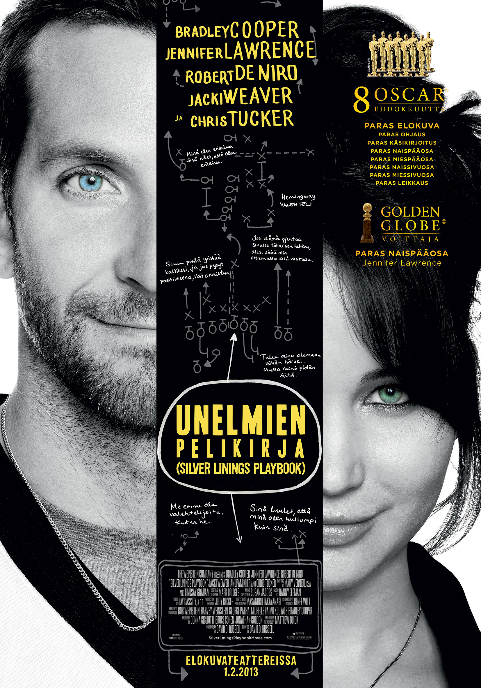 Ylistetty ja rakastettu arvostelu- ja yleisömenestys Unelmien pelikirja (Silver Linings Playbook) perustuu Matthew Quickin hauskaan, liikuttavaan ja tarkkanäköiseen esikoisromaaniin. David O. Russell (Taistelija, I Heart Huckabees, American Hustle) taikoi kirjasta omaperäisen ja särmikkään romanttisen komedian, jota tähdittävät roolistaan moninkertaisesti palkittu Jennifer Lawrence rinnallaan Bradley Cooper (The Words), Robert De Niro (Stone), Jacki Weaver, Chris Tucker ja Julia Stiles.